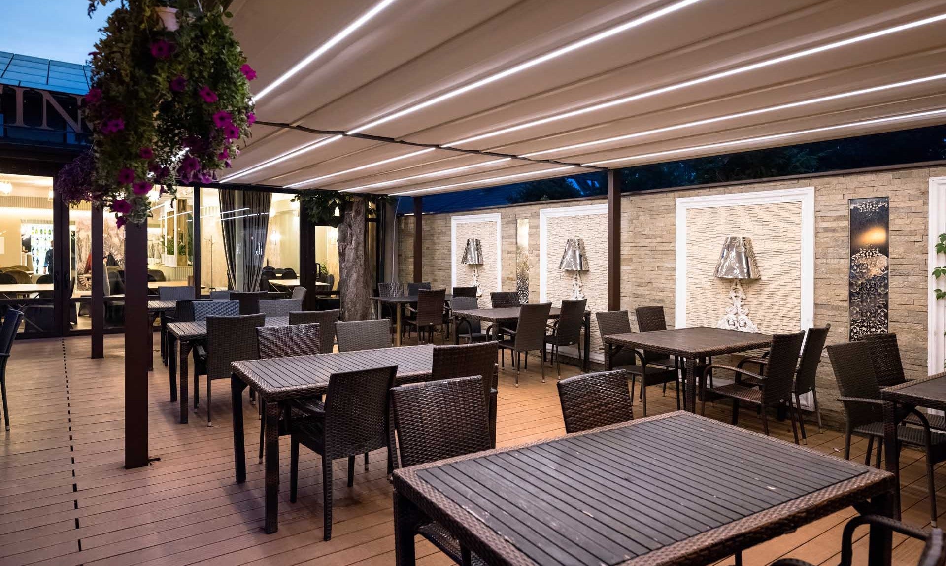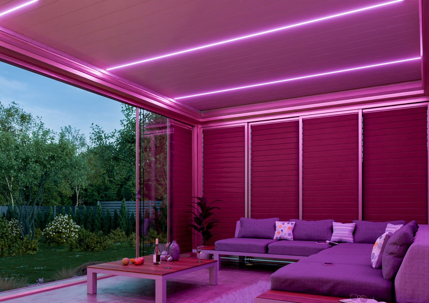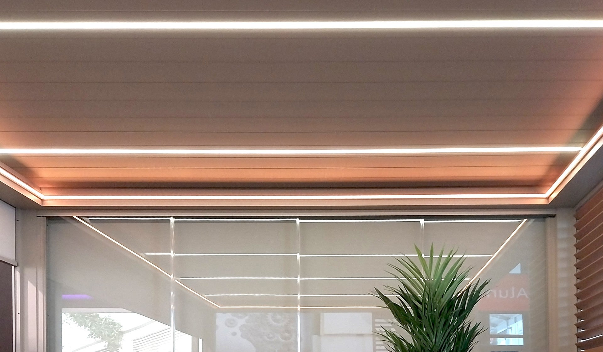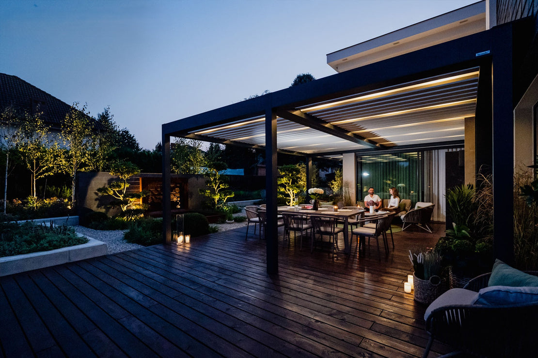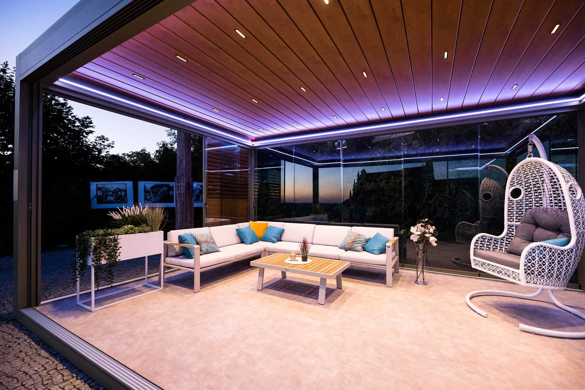 Die integrierte Beleuchtung verleiht jeder Terrassenüberdachung zusätzlichen Komfort und Stil. Hochwertige LED-Punkte oder Lichtleisten erzeugen zu jeder Tages- und Nachtzeit eine besondere Atmosphäre. Das Licht kann in warmweiß, kaltweiß oder RGB leuchten, sodass Sie das Ambiente flexibel an Ihre Wünsche anpassen können. Die LEDs sind dezent in Windschutzbalken oder Überdachungslamellen verbaut und lassen sich bequem automatisch steuern. Dank der Dimmfunktion können Sie die Lichtstärke flexibel regeln und eine angenehme, gemütliche Stimmung schaffen. Die Verkabelung ist elegant verborgen, während das moderne Design der Beleuchtung sich harmonisch in jede Umgebung einfügt und Ihre Terrasse oder Pergola stilvoll in Szene setzt.