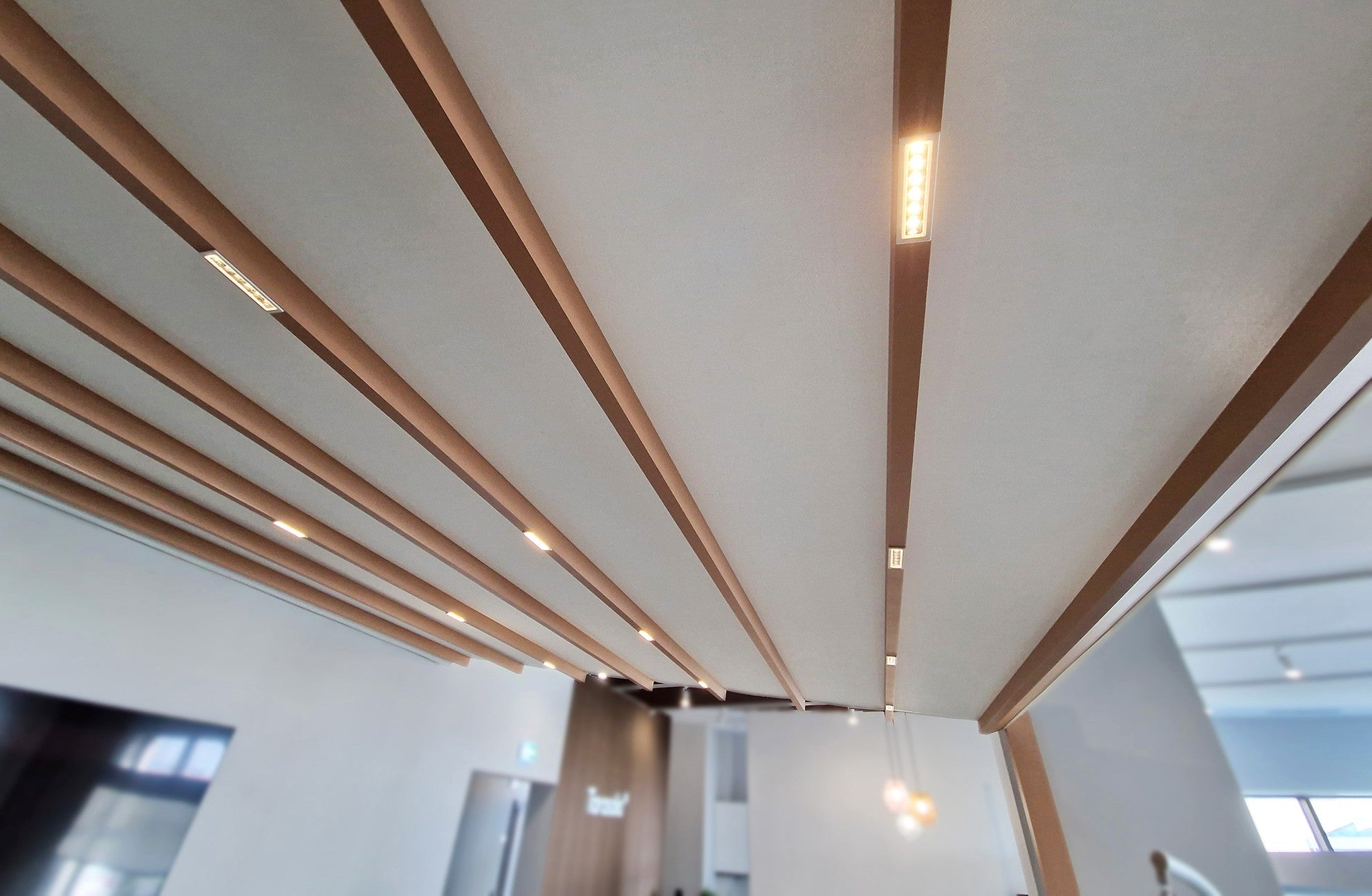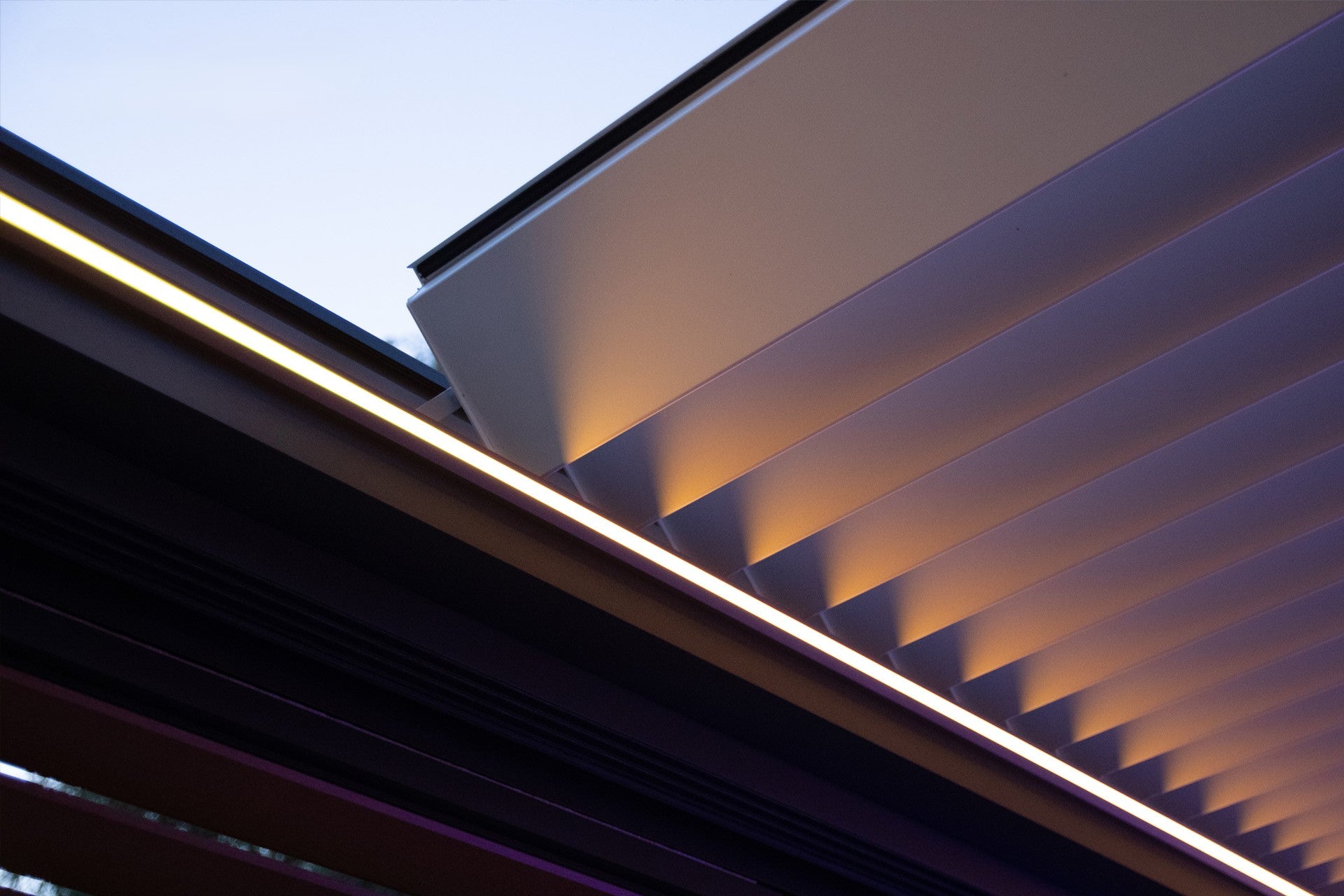 Die Außenbeleuchtung ist in den Konstruktionsbalken Ihrer Terrassenüberdachung integriert und greift in keiner Weise in das Gesamtkonzept der Raumgestaltung ein. Im Gegenteil, diskret platziert, beleuchten sie stimmungsvoll die Terrasse, den Balkon und die Gartenbereiche.