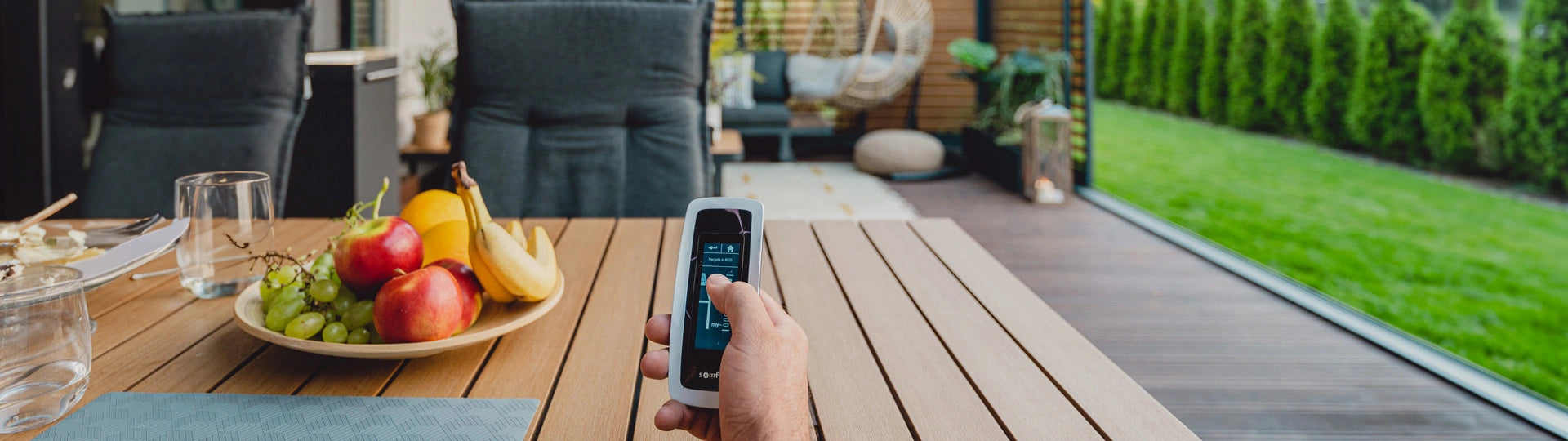 Unsere Stoffdächer können Sie mit dem zuverlässigen Somfy TaHoma-System steuern. Ob über Fernbedienung oder die Somfy-App – Sie haben die volle Kontrolle über Dachposition, ZIP-Rollos, Beleuchtung, Heizstrahler und das Audiosystem. Legen Sie individuelle Szenarien fest, passen Sie Licht, Wärme und andere Funktionen nach Ihren Bedürfnissen an und genießen Sie Ihre Stoffdächer komfortabel zu jeder Tages- und Jahreszeit. Dank einfacher Bedienung können Sie alle Funktionen schnell nutzen – für maximale Flexibilität und ein komfortables Outdoor-Erlebnis.