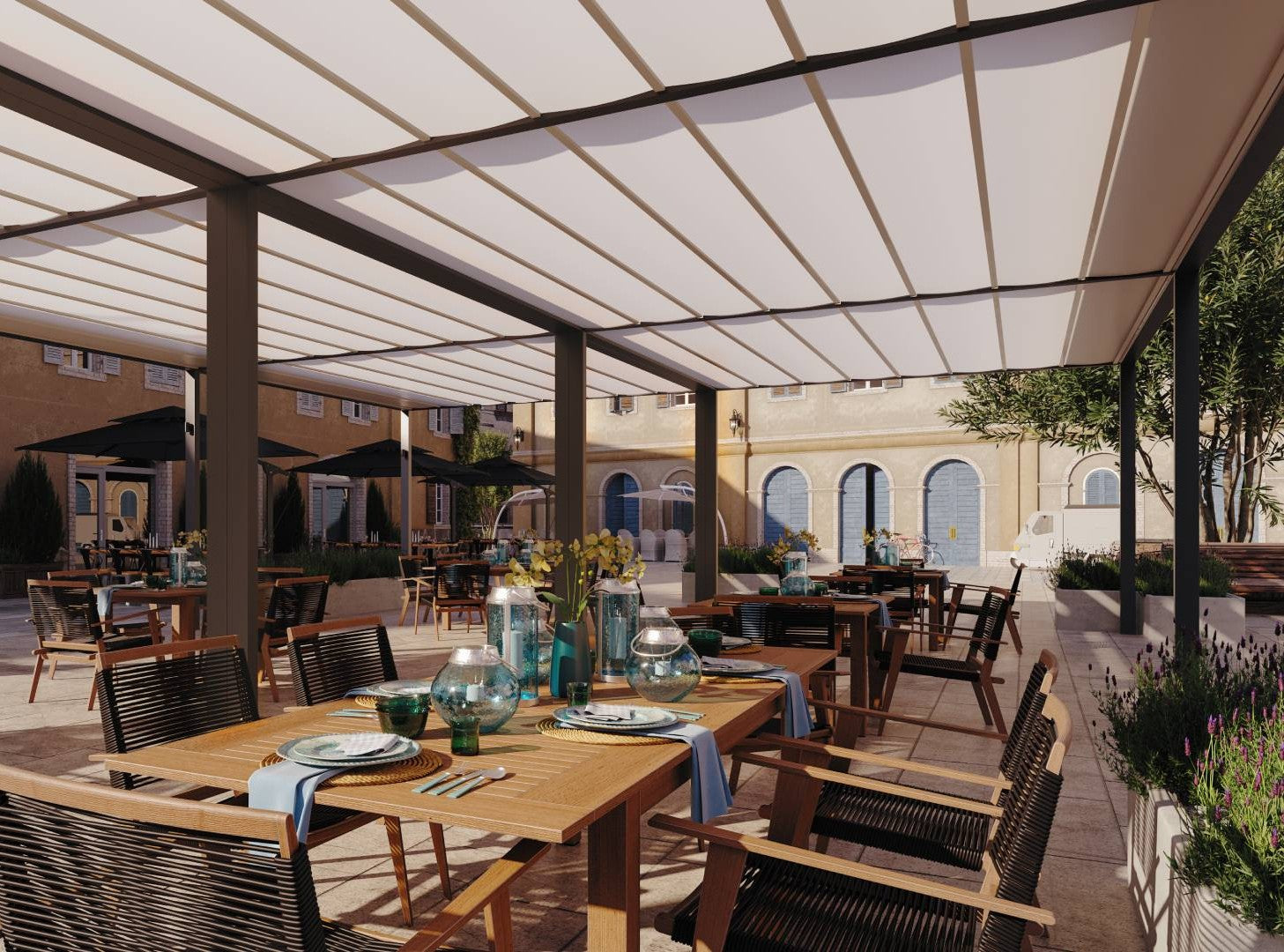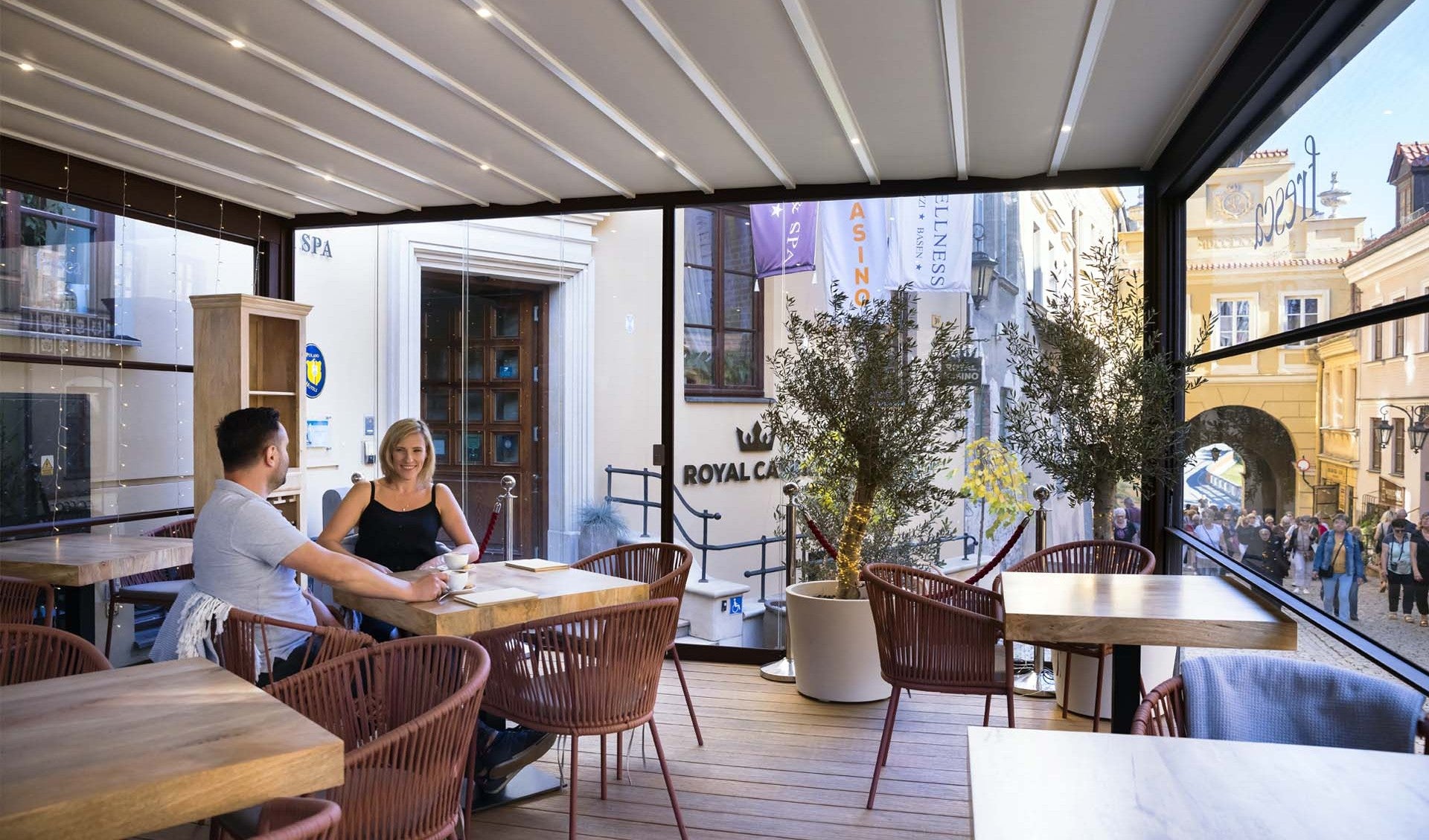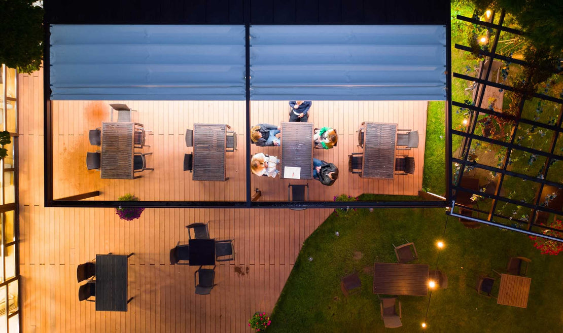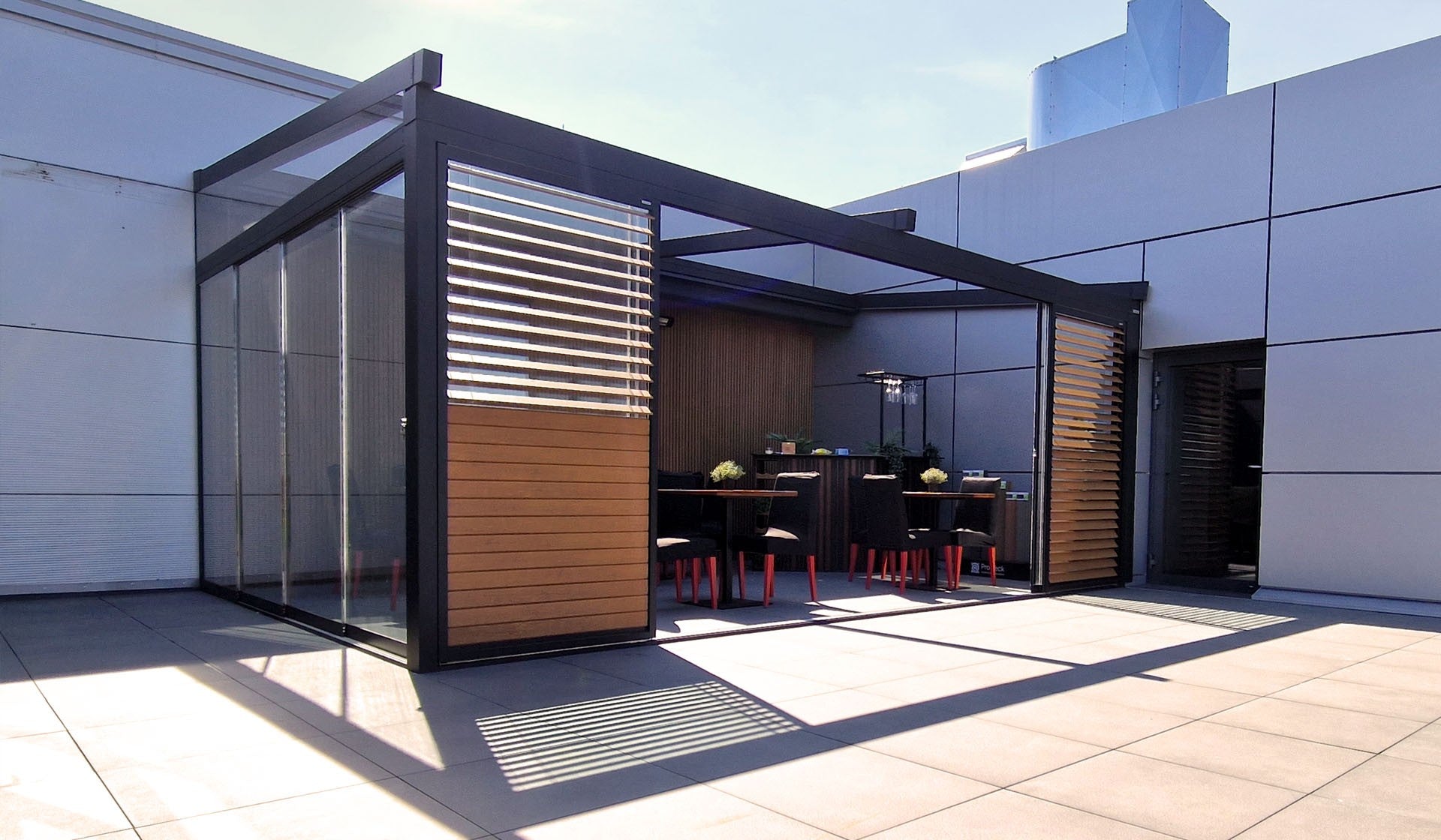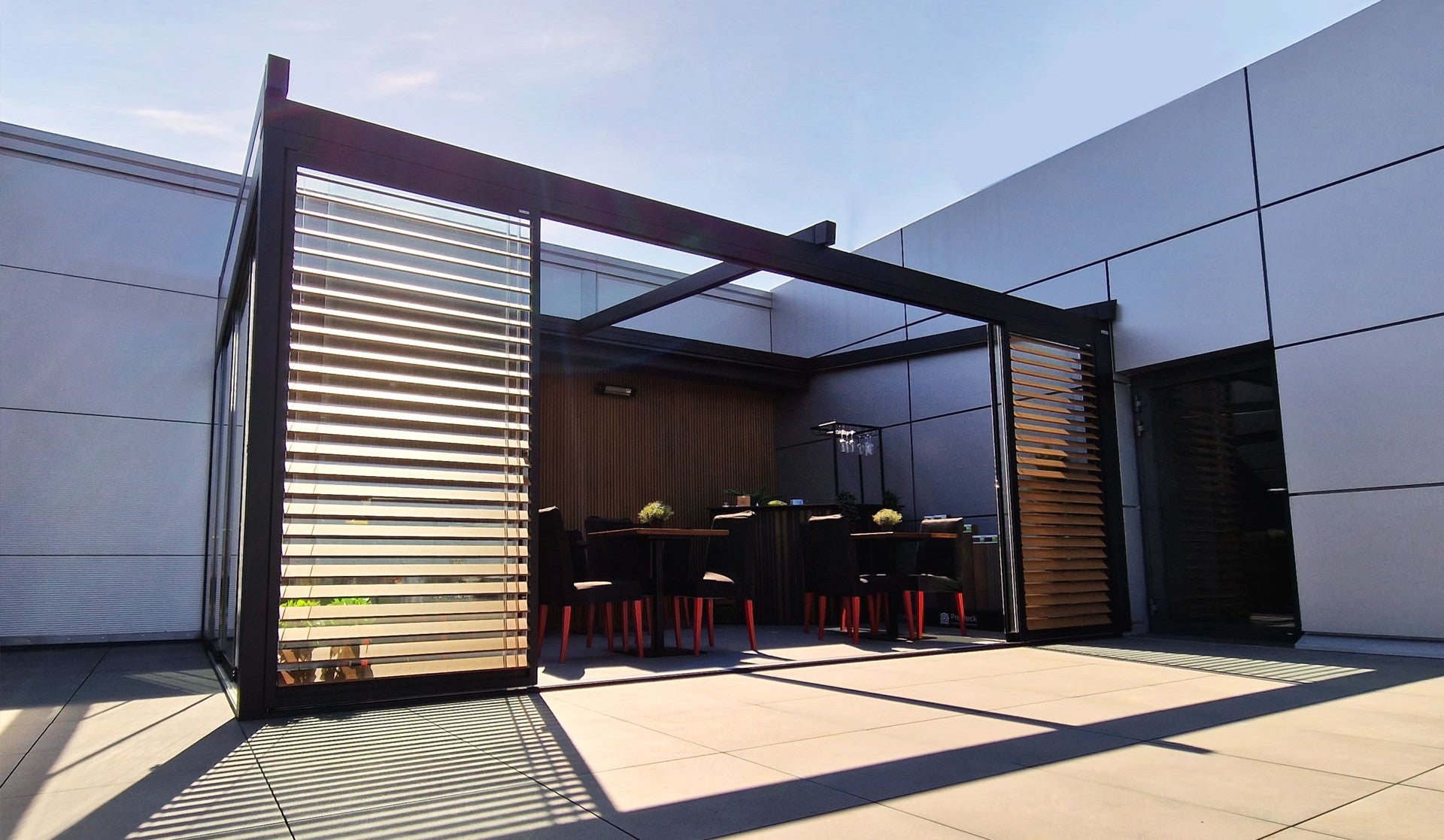 Die ProLine Überdachung ist die perfekte Lösung für gewerbliche Außenbereiche wie Restaurants, Hotels, Cafés oder Eventflächen.