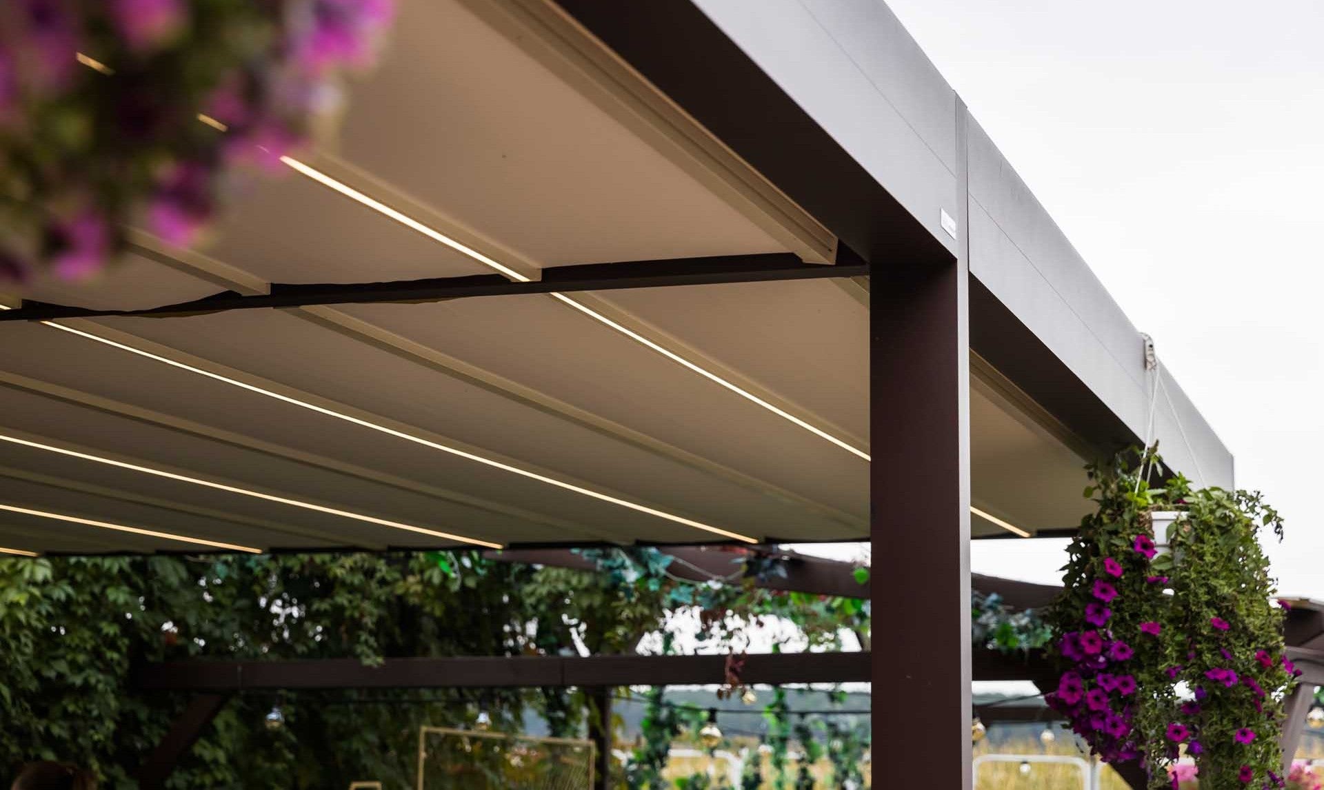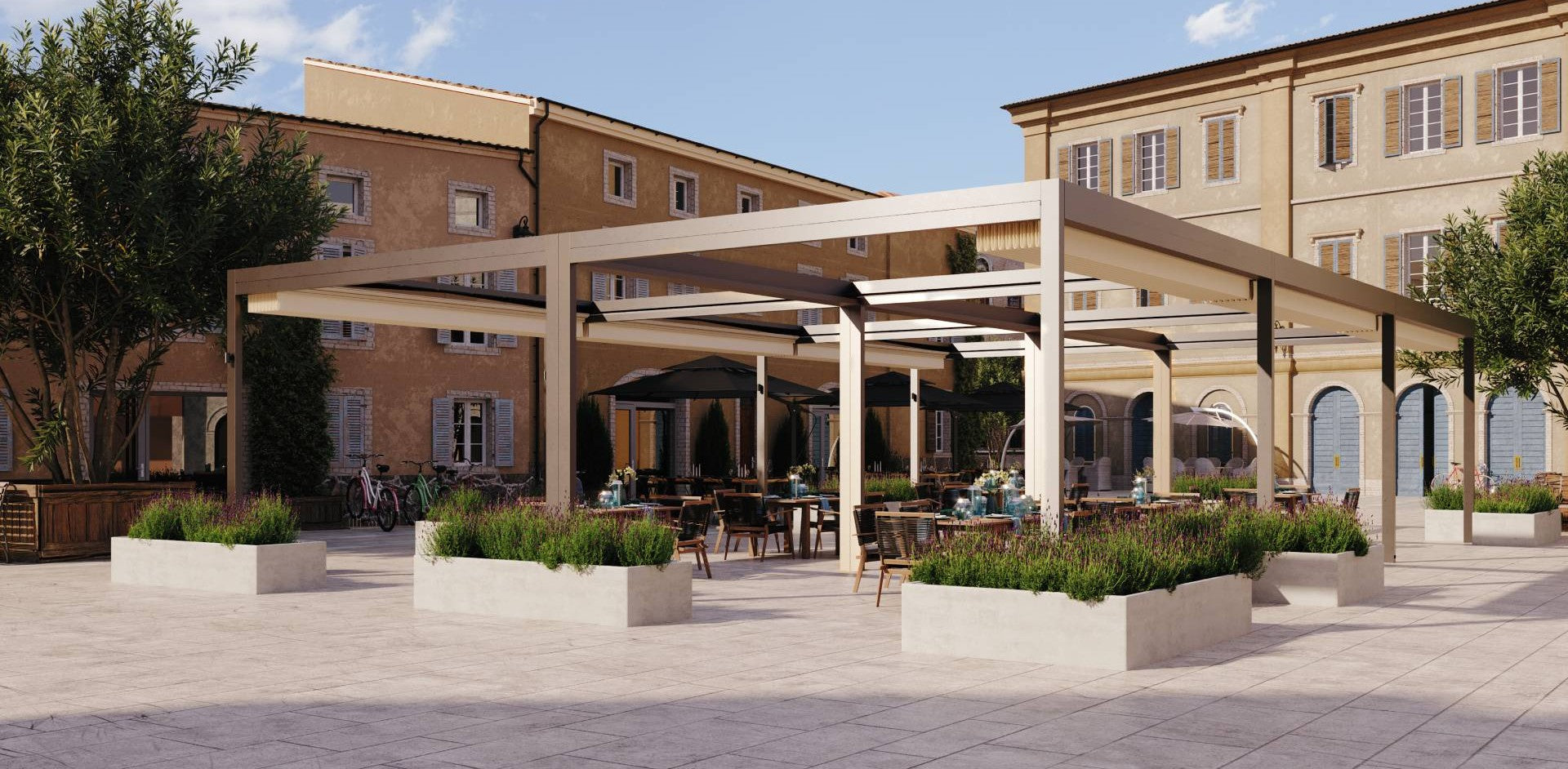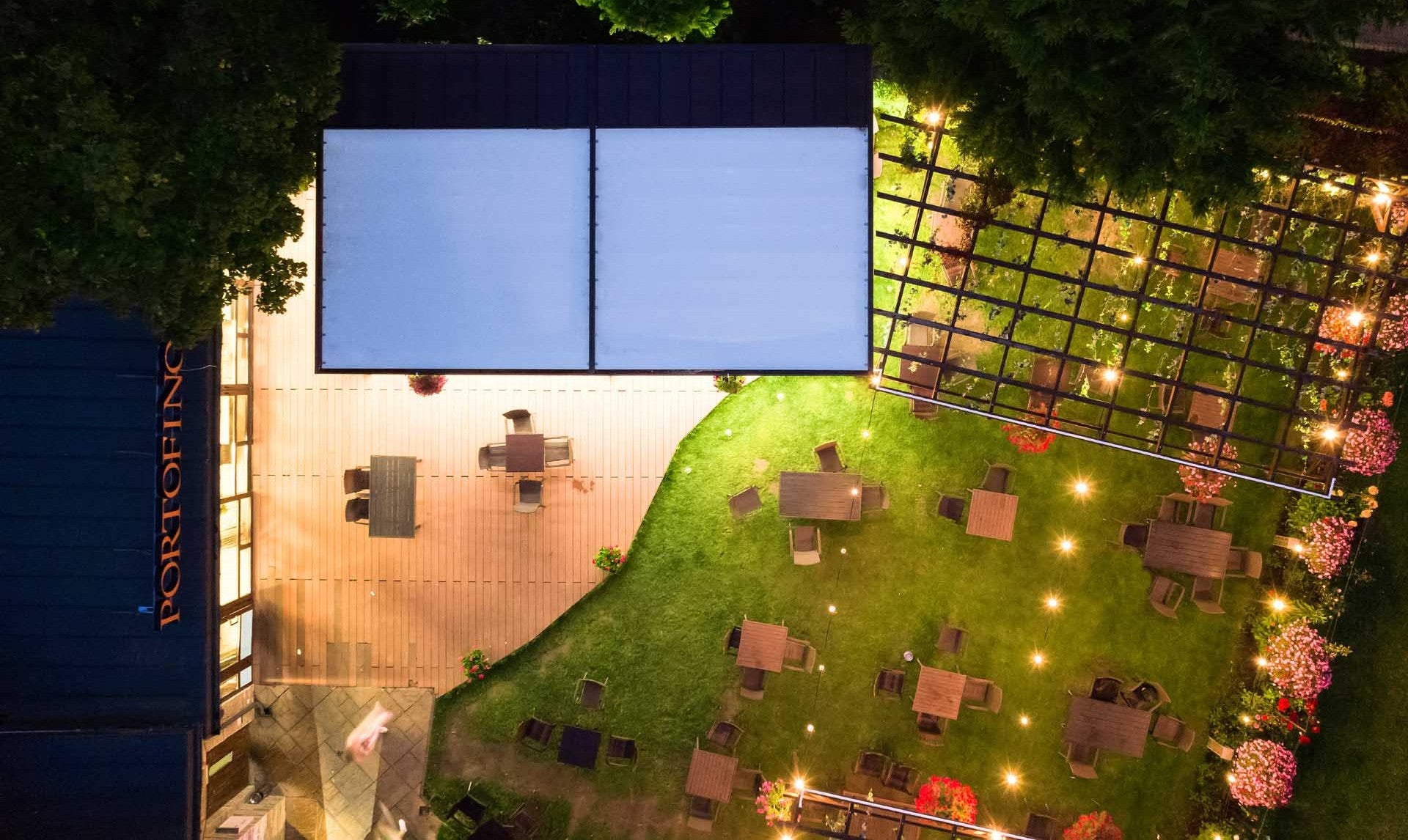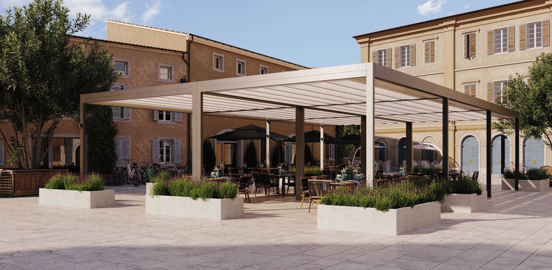 Die ProLine Überdachung ist die perfekte Lösung für gewerbliche Außenbereiche wie Restaurants, Hotels, Cafés oder Eventflächen.