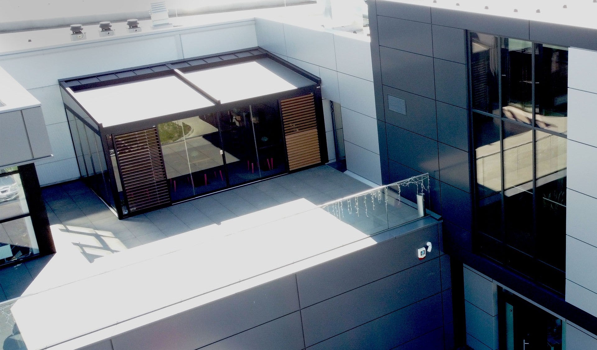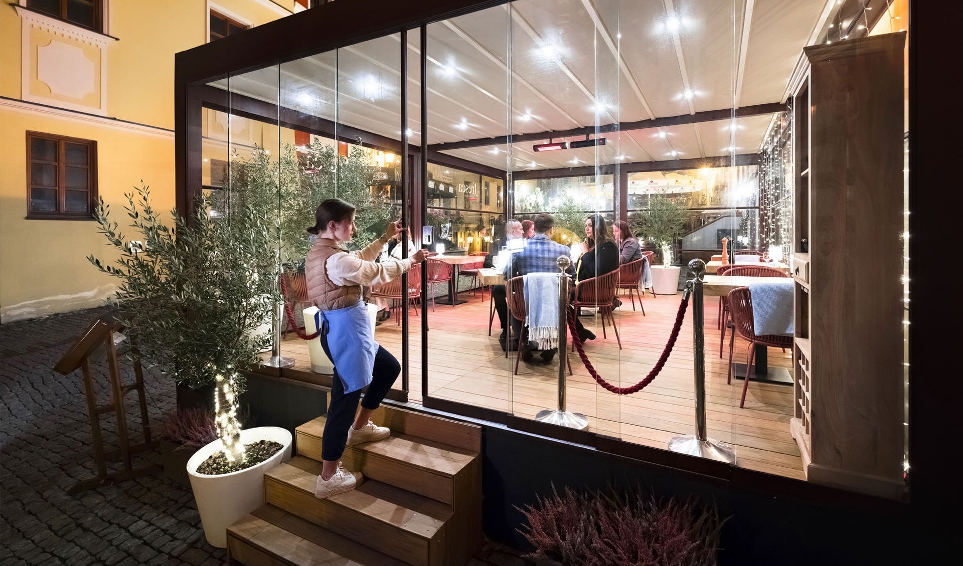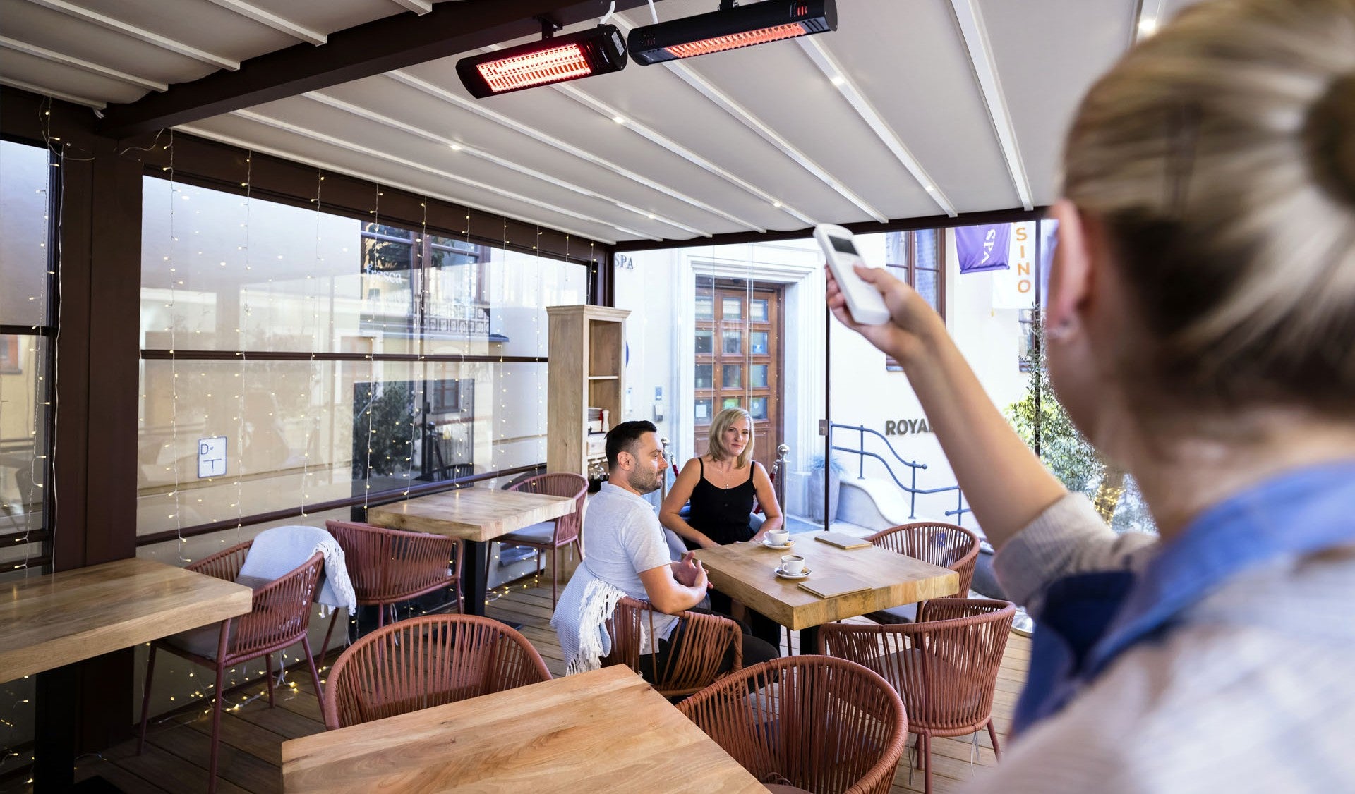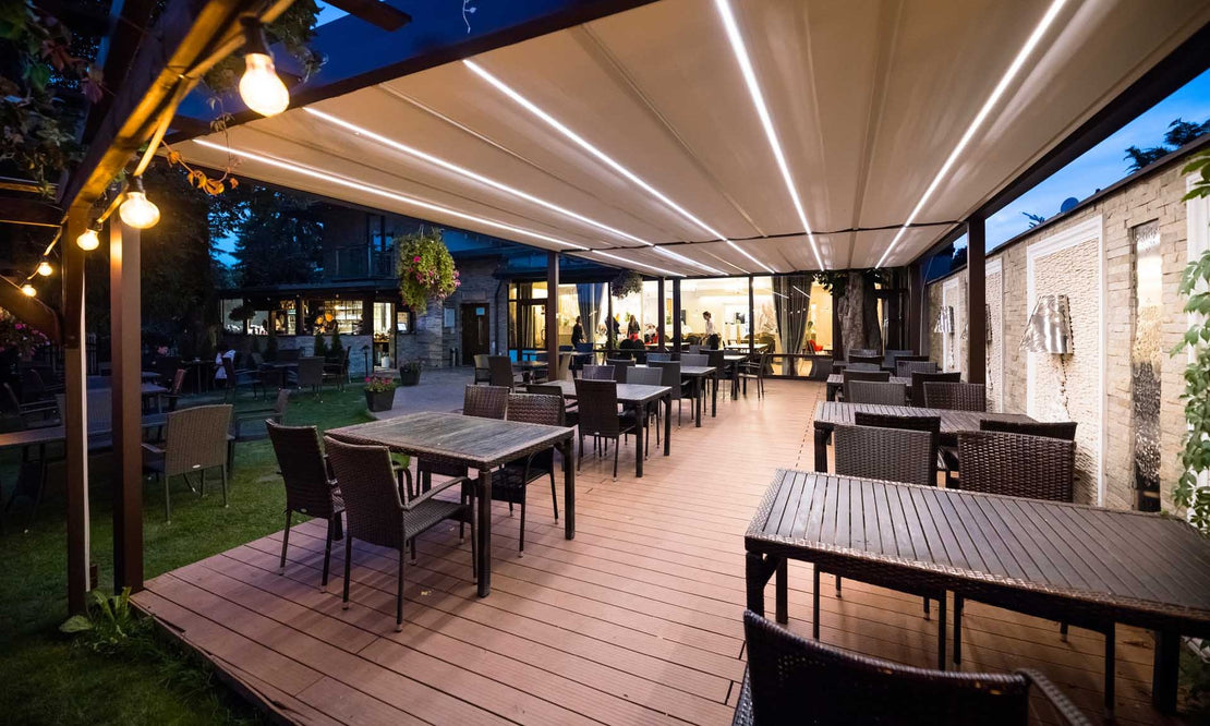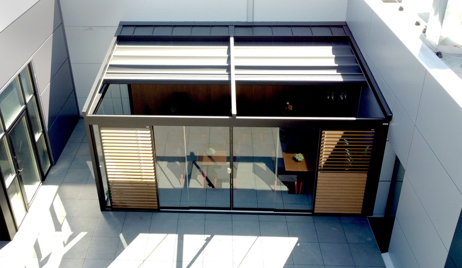 Die ProLine Überdachung ist die perfekte Lösung für gewerbliche Außenbereiche wie Restaurants, Hotels, Cafés oder Eventflächen.